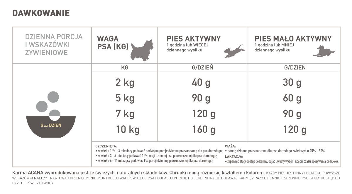 Psy małych ras mają takie same wymagania żywieniowe, jak psy duże. Oznacza to, że potrzebują diety bogatej w zróżnicowane składniki mięsne, niezbędne dla ich zdrowia. ACANA Adult Small Breed jest przepełniona kurczakiem i poławianą w naturalnym środowisku fl ądrą, a także odżywczymi jajami, dzięki czemu dostarcza wszystkiego, czego potrzebuje Twój pies małej rasy, aby pozostać szczęśliwym, zdrowym i silnym.